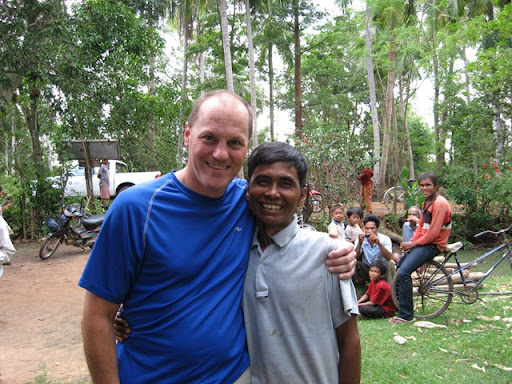 Once we got to the village we came to the Village Leader's home, as thatch-roof, bamboo home on stilts. There, under the home, were two CREDIT Officers (staff with WR's micro-lending program) who were handing out a few new loans. One of the recipients (seen here, smiling, as I snapped his photo) was very happy to talk to us after he got his loan. John Schmidler (below) and he bonded a bit. He told us he would use the money to buy seed--more seed than he could harvest from this year's crop) so that his next planting will be much larger. He was so happy.